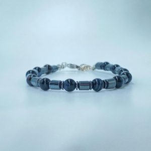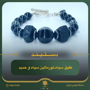 دستبند عقیق سیاه سلیمانی با تراش کروی ۶ میلیمتری و حدید استوانه ای